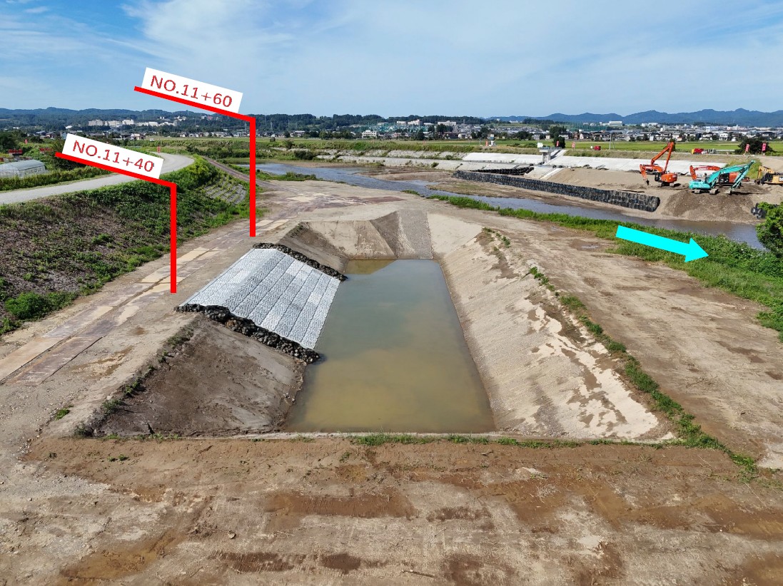 増工工事の右岸低水護岸工施工のための仮締切堤防が完了しました。