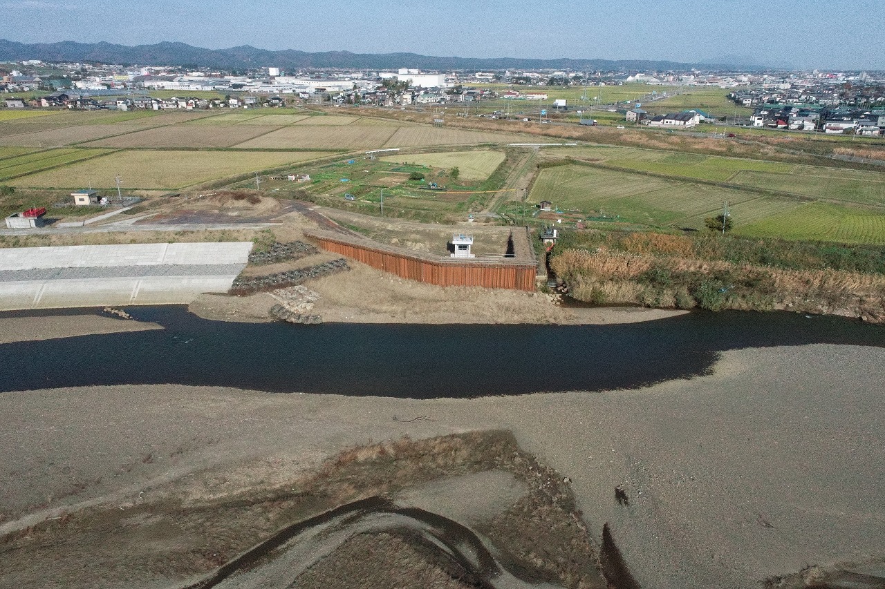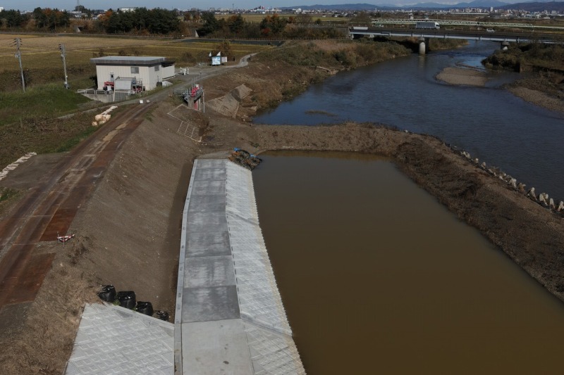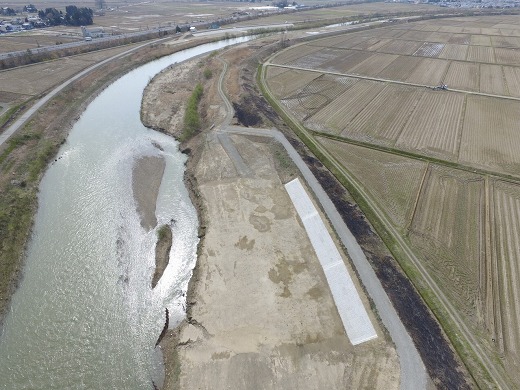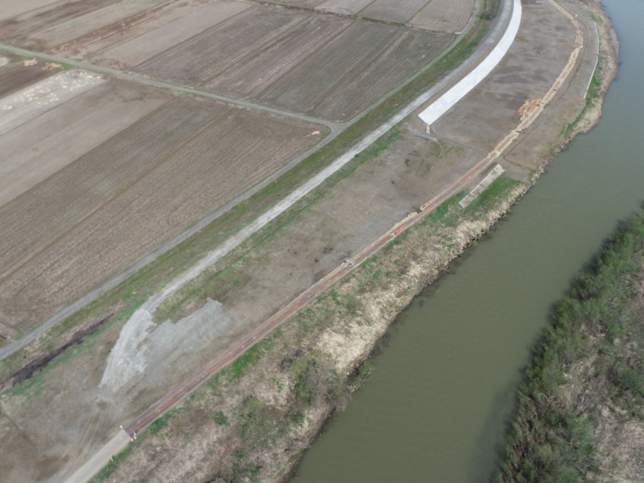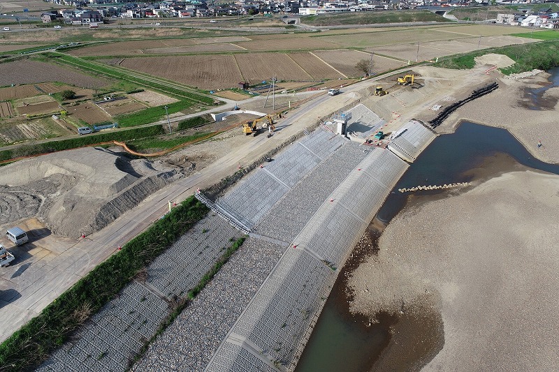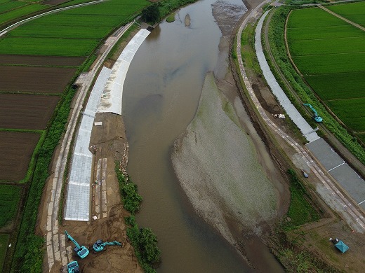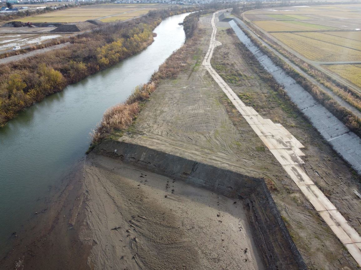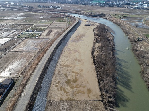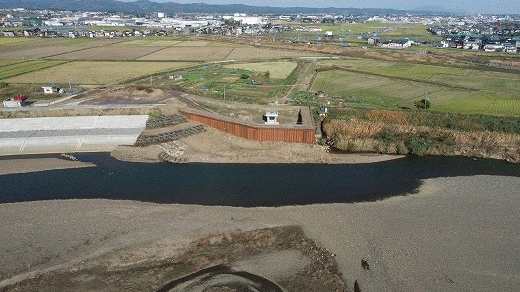 増工工事の右岸低水護岸工施工のための仮締切堤防が完了しました。
