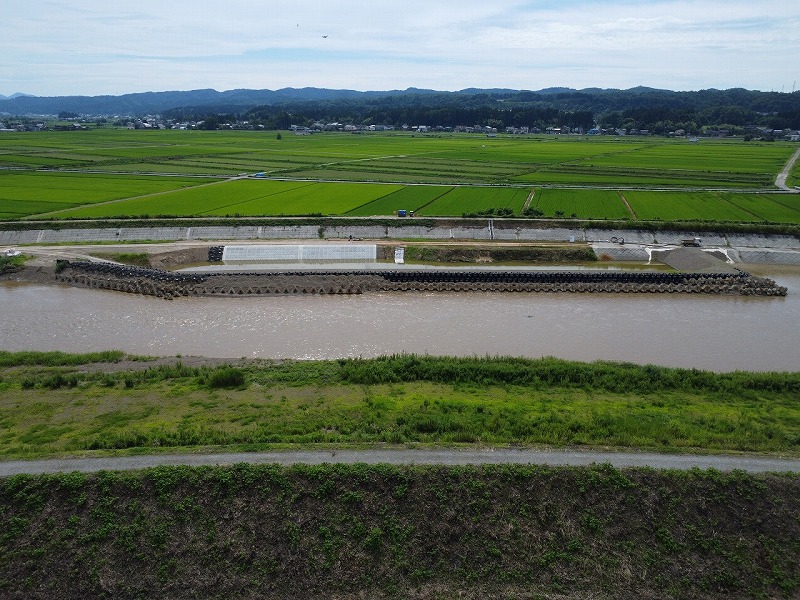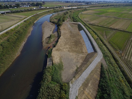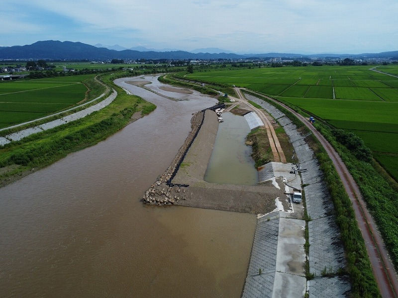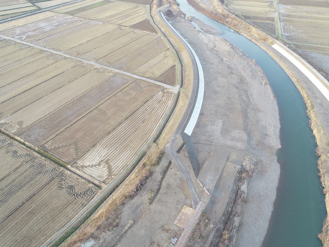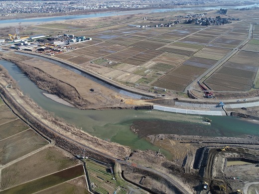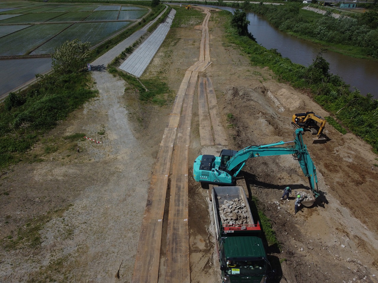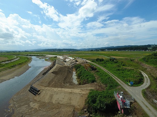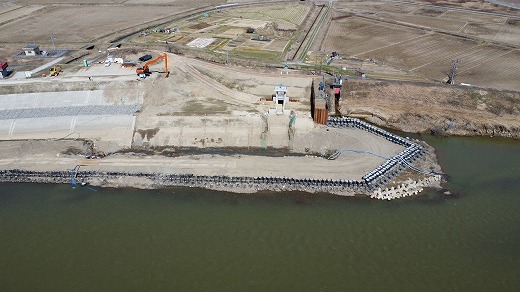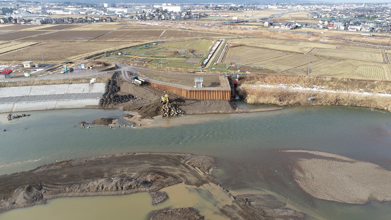 増工工事の右岸低水護岸工施工のための仮締切堤防が完了しました。