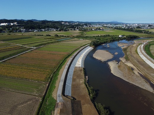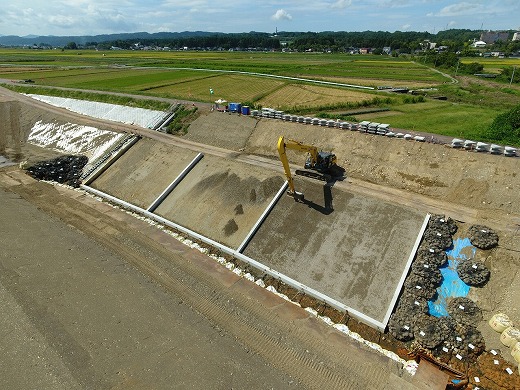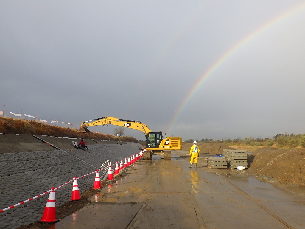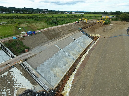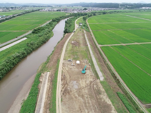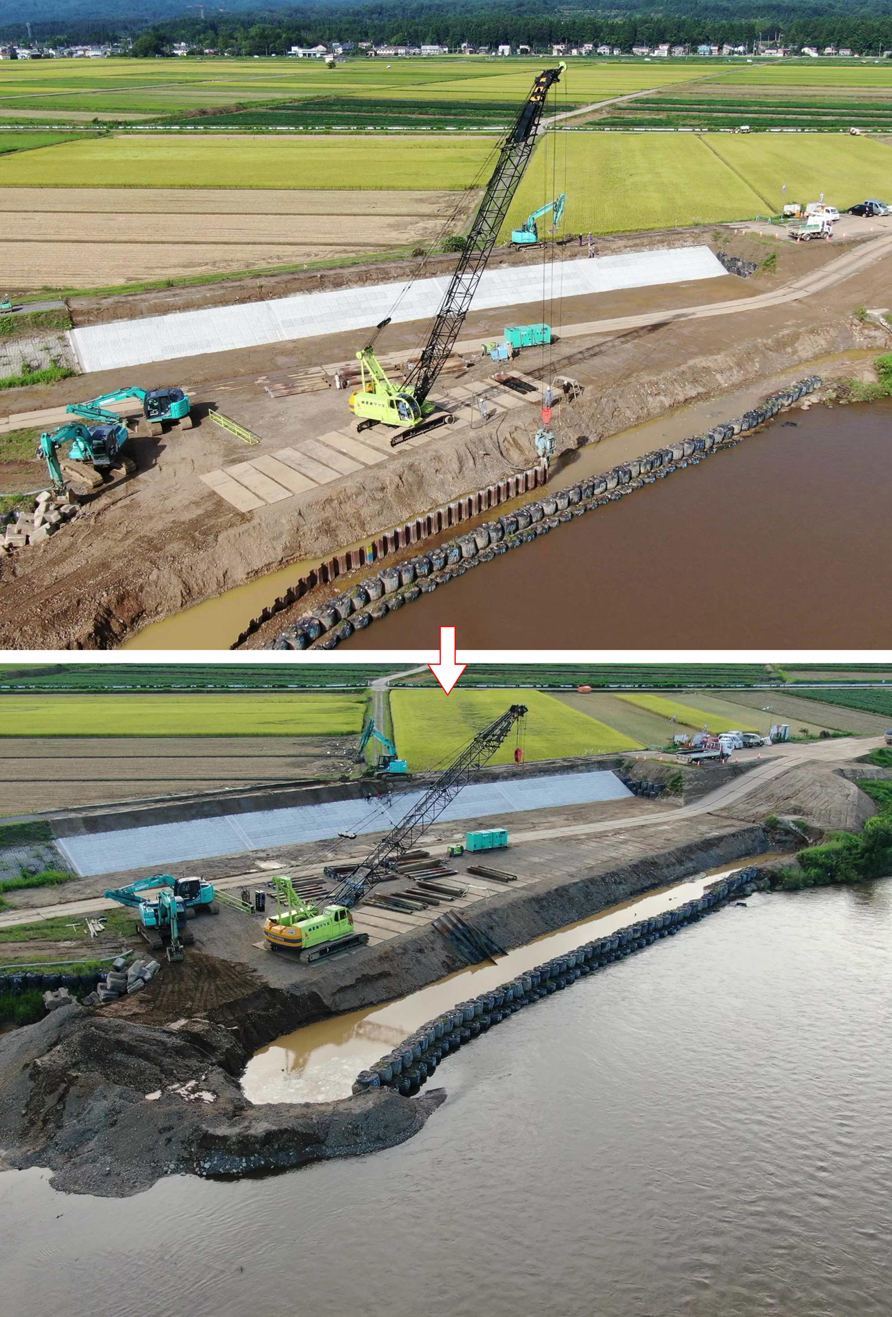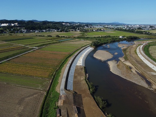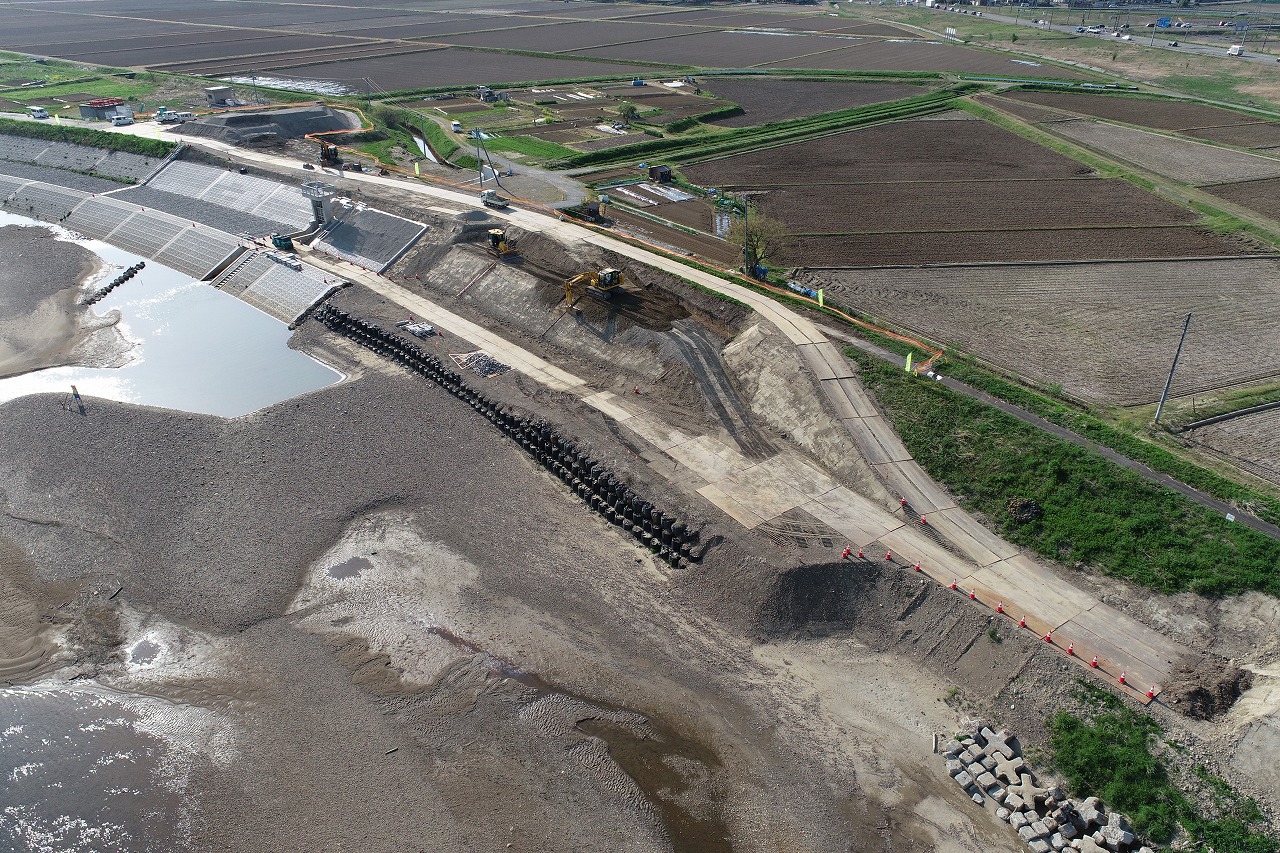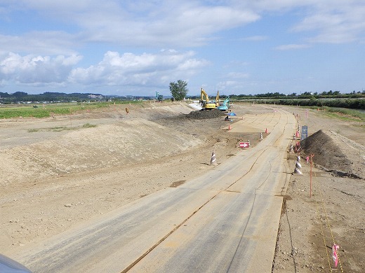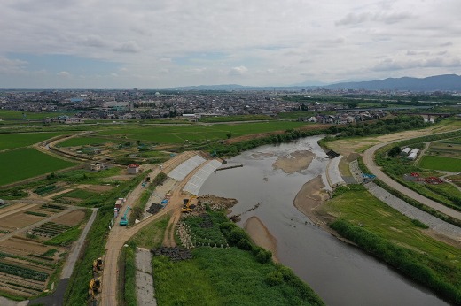 増工工事の右岸低水護岸工施工のための仮締切堤防が完了しました。