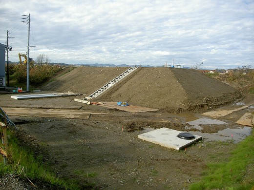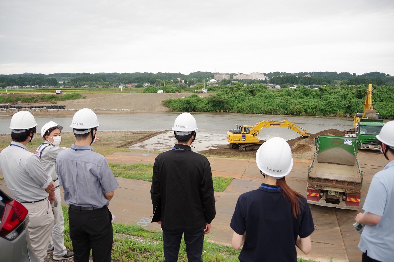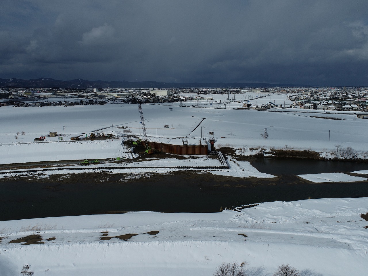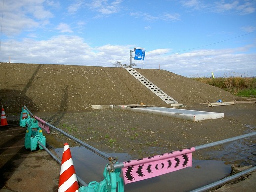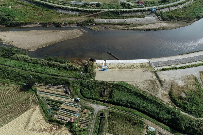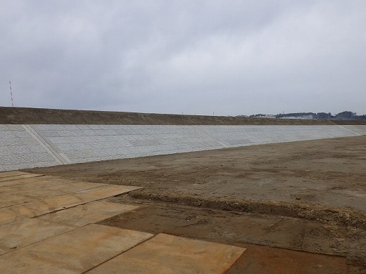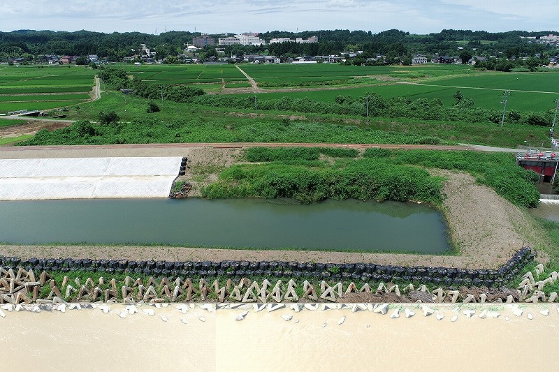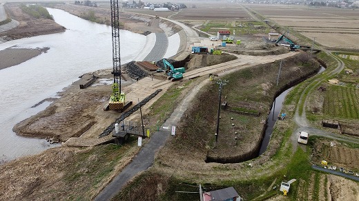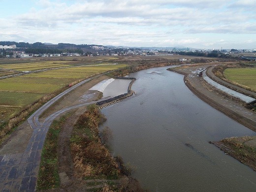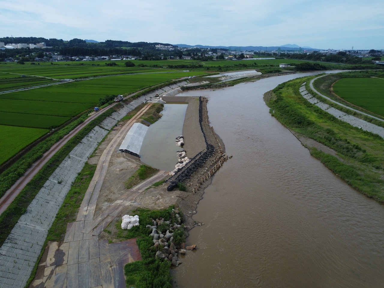 増工工事の右岸低水護岸工施工のための仮締切堤防が完了しました。