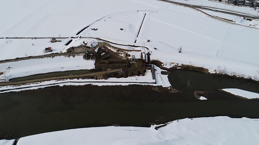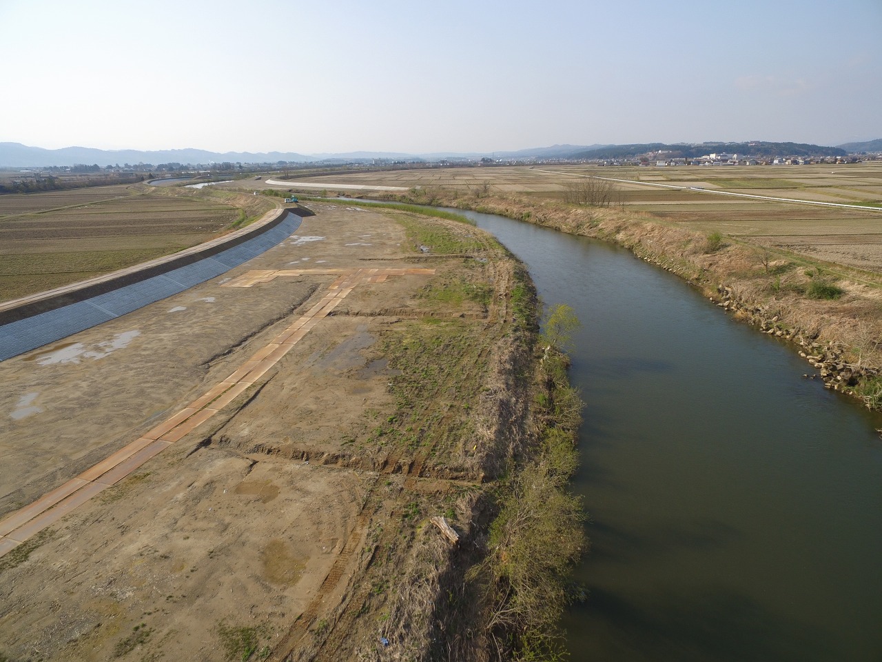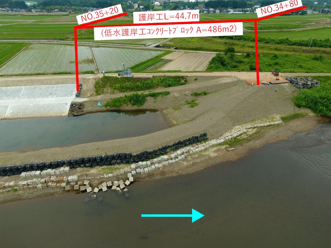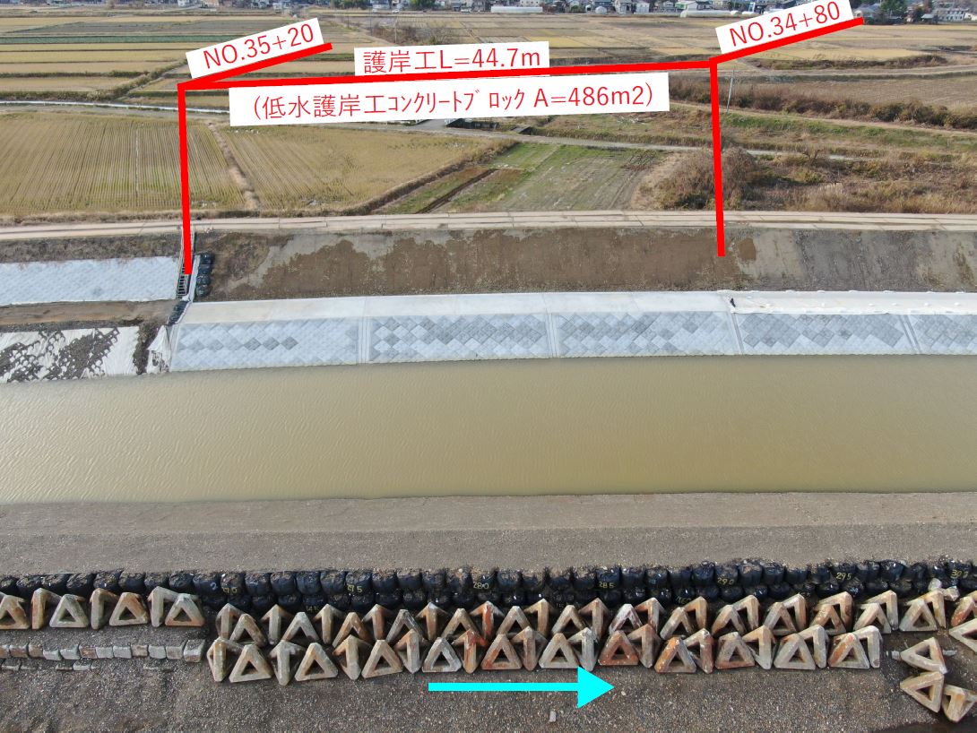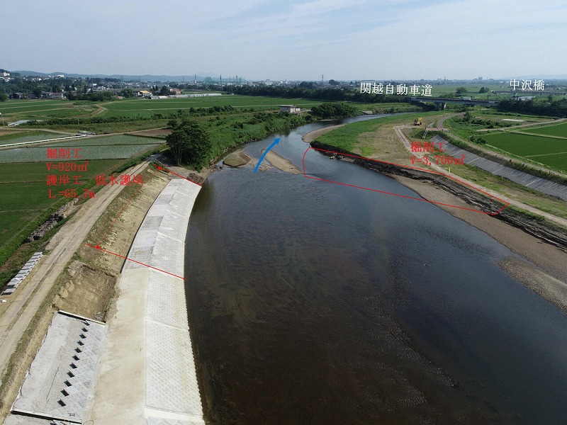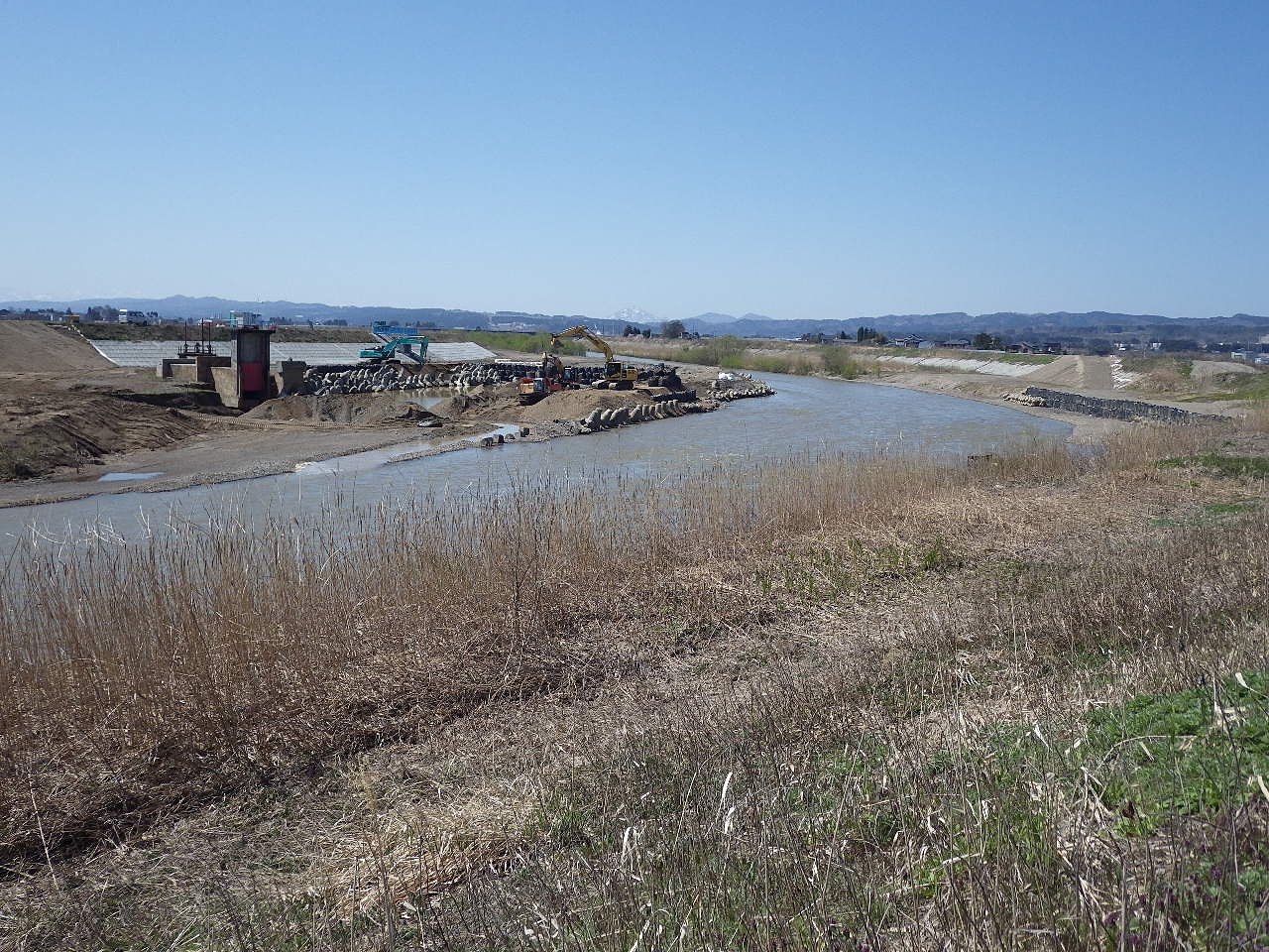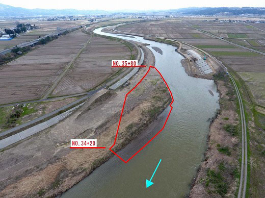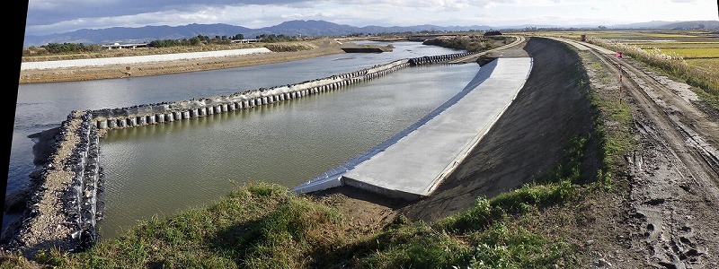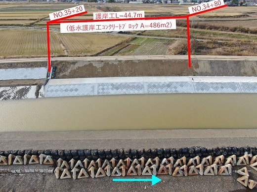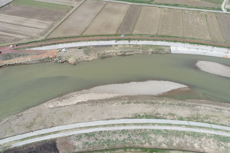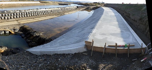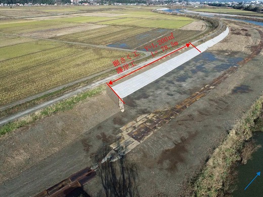 この工事は繰越しとなり、年度をまたいで右岸側の低水護岸工を増工で行うことになりました。