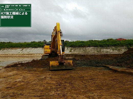 ICT建機にて、掘削・土砂搬出作業を行っております。