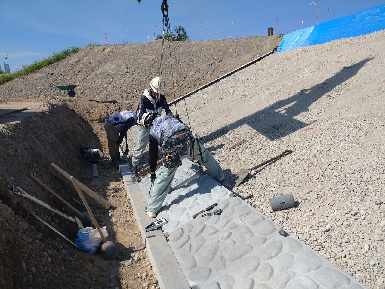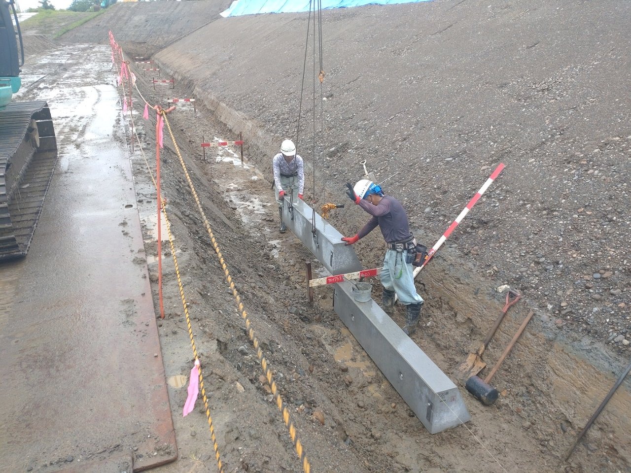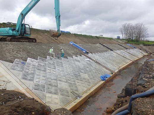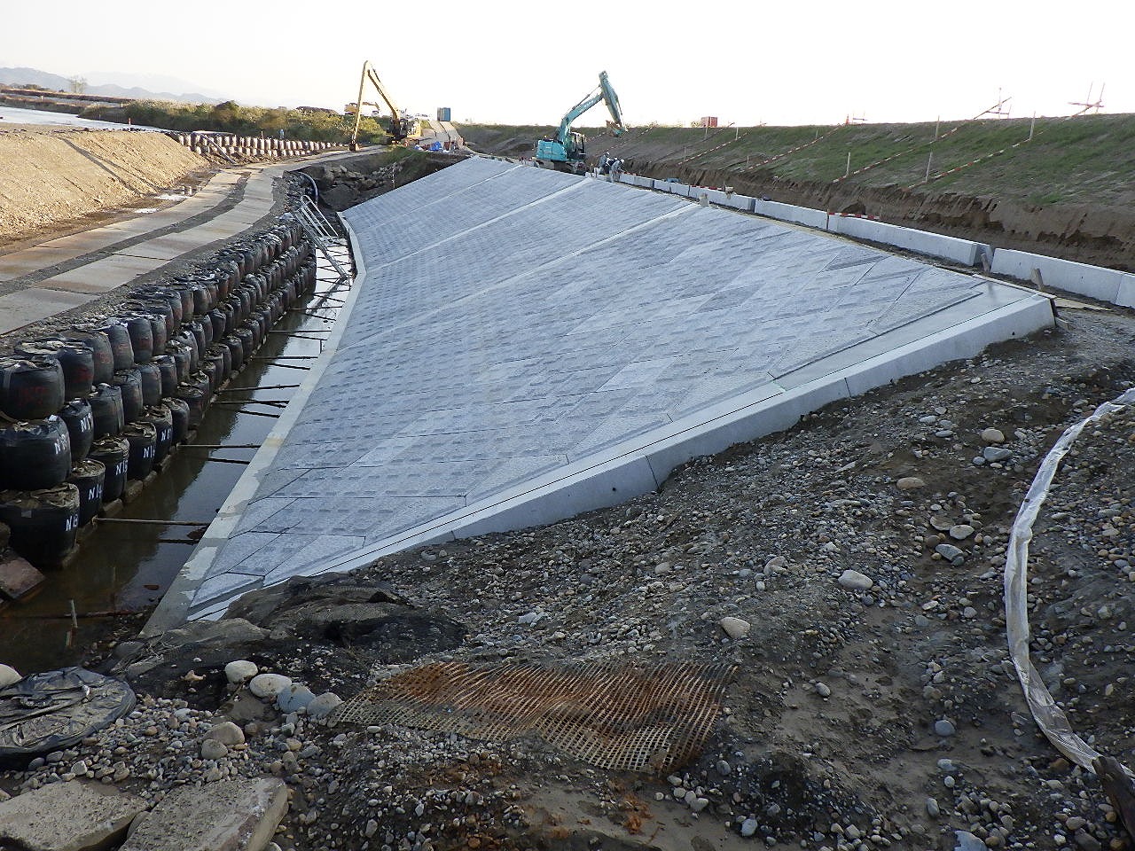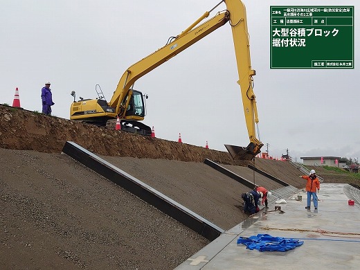 土砂中に既存していた旧コンクリート護岸を撤去し、掘削・仮設工を行って法覆護岸工の大型谷積ブロック作業を行っております。
