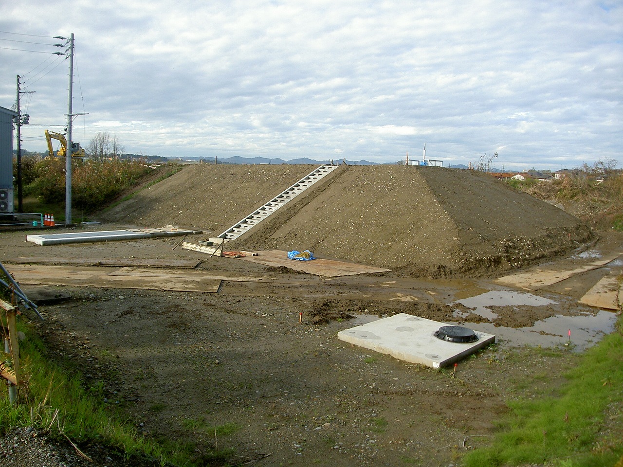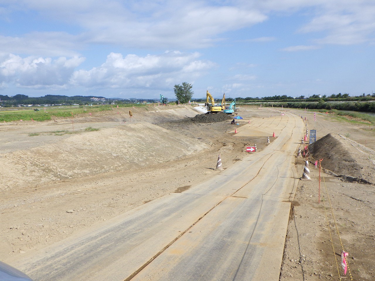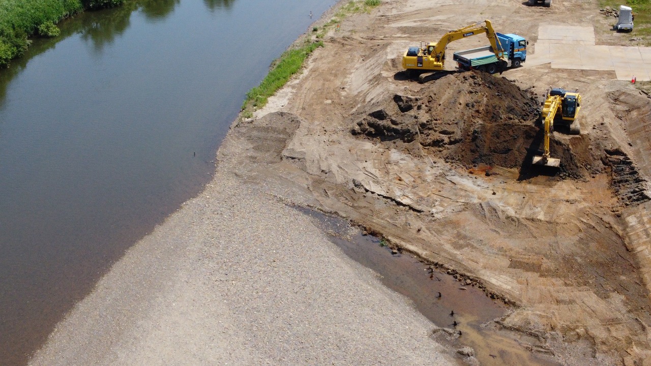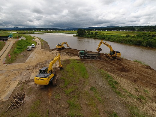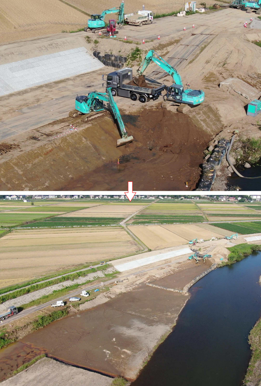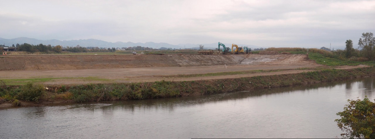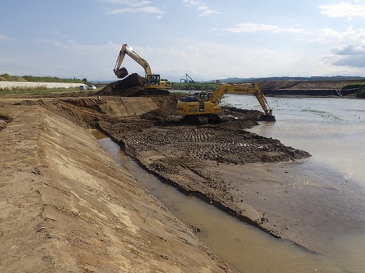 現在は、既設サイフォン撤去のために築造した仮締切堤防を、低水護岸工施工のための仮締切堤防に作り変えています。