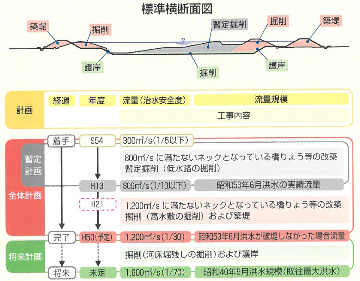 平成21年度には、昭和53年災害時の飯塚水位観測所での流量800m3/sが流れる断面を確保しました。