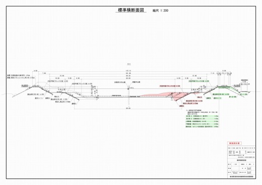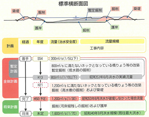 その後、河川整備計画流量の1,200m3/sの流下能力確保に向け、下流から河道改修を実施しており、